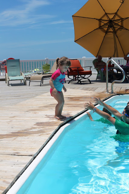 Every day just before lunch, we'd head up to the pool for a quick dip. Monday was the first day Amelia got up the nerve to jump in off the side. AND DID SHE EVER. She specifically asked me to include these for your viewing pleasure. (There were more. So many, many more. She wanted me to include them ALL. I am sparing your eyeballs.)